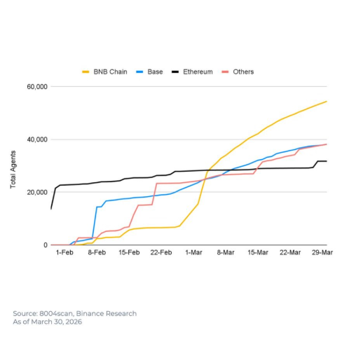 Según los datos de registro, el crecimiento en BNB Chain fue especialmente rápido: pasó de 4 agentes el 3 de febrero a más de 54.000 en marzo. Entre los factores que explican este liderazgo están los costos de transacción bajos, que permiten a los agentes operar de forma continua sin que las tarifas reduzcan su viabilidad económica. Además, la adopción temprana del estándar ERC‑8004 en BNB Chain (febrero de 2026), junto con extensiones como BAP‑578, contribuyó a su rápido crecimiento.