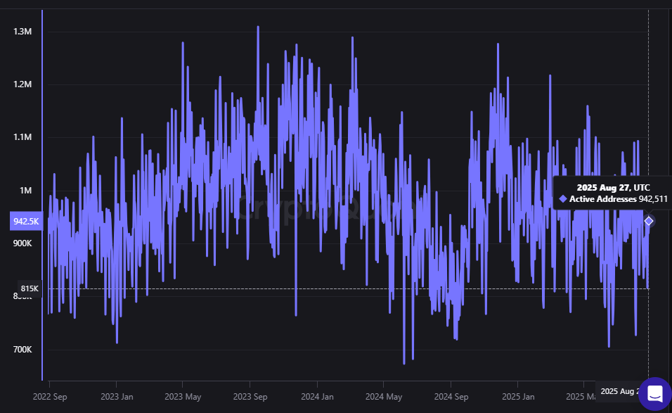 De acuerdo con datos de CryptoQuant, al 27 de agosto había unas 940.000 cuentas activas en la red. La cifra representa una reducción del 27% frente a noviembre de 2024, cuando casi 1,3 millones de direcciones tuvieron actividad en un mismo día.