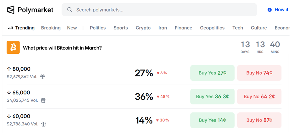 Las estimaciones surgen tras una caída a alrededor de los 60.000 dólares en la primera semana de febrero, antes de que el precio se recuperara. El rebote de bitcoin, que llegó a los 76.000 dólares el 17 de marzo, había reforzado la percepción de que el mercado podría estar retomando impulso, motivando a los usuarios de la plataforma a apostar por escenarios de subida.