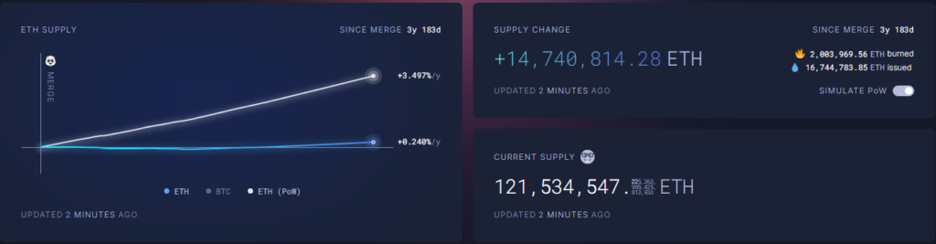 Aunque el Merge redujo drásticamente la emisión diaria en comparación con la minería de Prueba de Trabajo (PoW), la cantidad de ETH destruido ha disminuido de forma constante. Desde febrero de 2025, tras la actualización Pectra en diciembre de 2024, Ethereum ha dejado de ser deflacionario de manera sostenida, una tendencia que se intensificó tras la actualización Pectra, la cual consolidó un camino inflacionario debido a los cambios estructurales en la gestión de datos y las tarifas de la red.