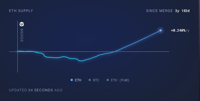 Según datos de la plataforma de análisis ultrasound.money, el suministro total se sitúa actualmente cerca de los 121,53 millones de ETH, lo que representa una tasa de inflación anualizada de aproximadamente el 0,24%.